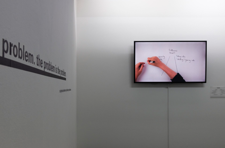 The installation was a result of a commissioned for the Text and Its Performance, which took place at CSW Bunkier Sztuki in Kraków. It focused on the narrative approach to conflict resolution. Narrative mediation emerged from social constructionist theory and it proposes that people perceive reality through the prism of their culture and previous experiences, assigning particular meanings to what they see and creating narratives, which exclusiveness may lead to conflict. Narrative mediation is a way of resolving conflict (and understanding it as a natural element of social relations) without ruling about the blame, where both sides work together to create new, free from conflict and shared narrative. One of the main assumptions of this type of mediation is Michael White’s statement “the person is not the problem; the problem is the problem” – externalising conflict allows for moving attention from people in conflict to the situation of conflict, which helps to find a way towards mutual understanding. Hommo Narrans consisted of wall text, film and mediation letters. While the film and the text referred to theoretical principles of narrative mediation, the letters were a concrete example of coming out of a conflict. They were informed by the mediations I led in East London, as a volunteer for the Common Ground Charity.