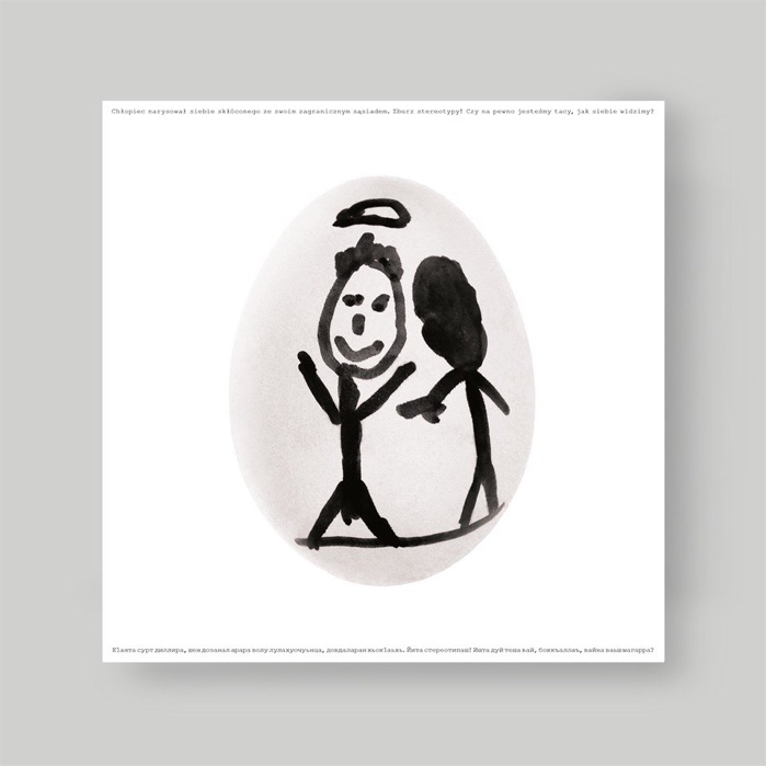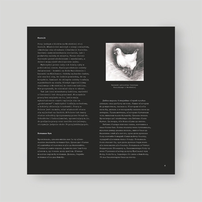 Nie biało-czarna książka dla dzieci i dorosłych powstała we współpracy Magdy Fabiańczyk i Poli Nowak-Tyszowieckiej z mieszkańcami osiedla socjalnego na ulicy Wrońskiej w Lublinie oraz z mieszkańcami Ośrodka dla Obcokrajowców na tej samej ulicy. Inspiracją dla zawartego w niej opowiadania o kurze i jajku jest historia wywalczonego z urzędem miasta kurnika. Ilustracjami rysunki mieszkańców oraz fotografie kartonowych modeli osiedla, które zbudowałyśmy razem z dziećmi polskimi i czeczeńskimi, i które pomogły nam rozpocząć rozmowę na tematy: domu, społeczeństwa, przynależności, nietolerancji, nienawiści, strachu...