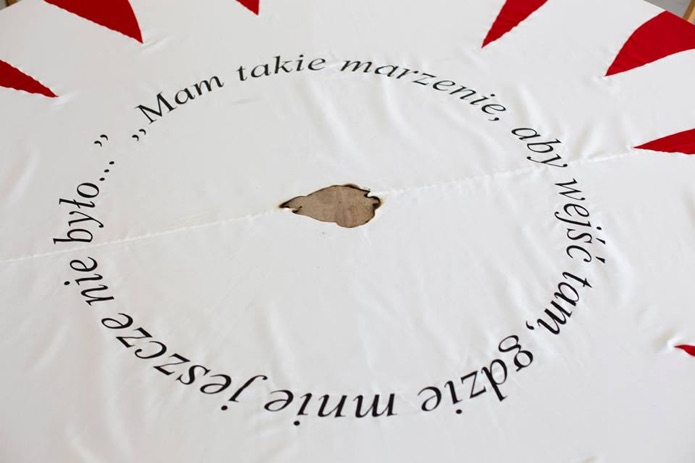 Inspired by the entrepreneurial role of women in the Roma community from Bobrek, the table cloth in ‘Where I Was Not’, refers back to a traditional Roma skirt – sewn on a circular plan, and which now only exists as a relic. The color and shape on the tablecloth is informed by both the Romani and Polish flags – although the first record of the presence of Roma in Poland dates back to the 14th century, Roma people are often perceived separately, as ‘other'. The central element of the tablecloth are the words 'I would like to enter, where I have not been yet', originally spoken by Mirga-Piotrowska these words raise that the presence of Roma in Poland is defined by invisible borders. The stigmatising of stereotypes around Roma people means that when going to a match or a disco, they can become the target of an attack. The burnt hole in the middle of the tablecloth is a symbolic reference to one such attack. The table covered with a tablecloth became a meeting place for the Roma people to share dialogues with representatives of the city’s authorities, during which they attempted to work out strategies to counteract existing stigmatization. In the following years, the tablecloth served as a place of debate in other art institutions, both in Poland and abroad, including at the Museum of Roma Culture in Brno.